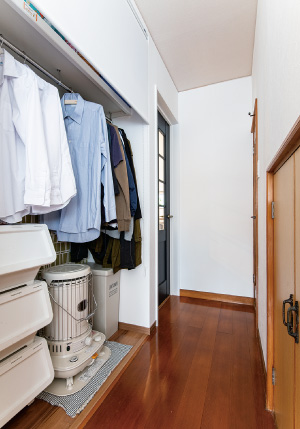 LDK入り口の横にはもともと和室の押し入れがあったが、今回和室をなくしたことにより、空間を有効活用するため廊下側の壁を取って収納スペースに。