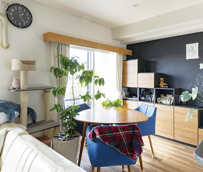 猫たちが自由に歩き回るLDKはペット用のフローリングに張り替えた。傷も付きにくく、猫も歩きやすそう。壁のクロスも張り替え、明るく清潔感のある空間に
