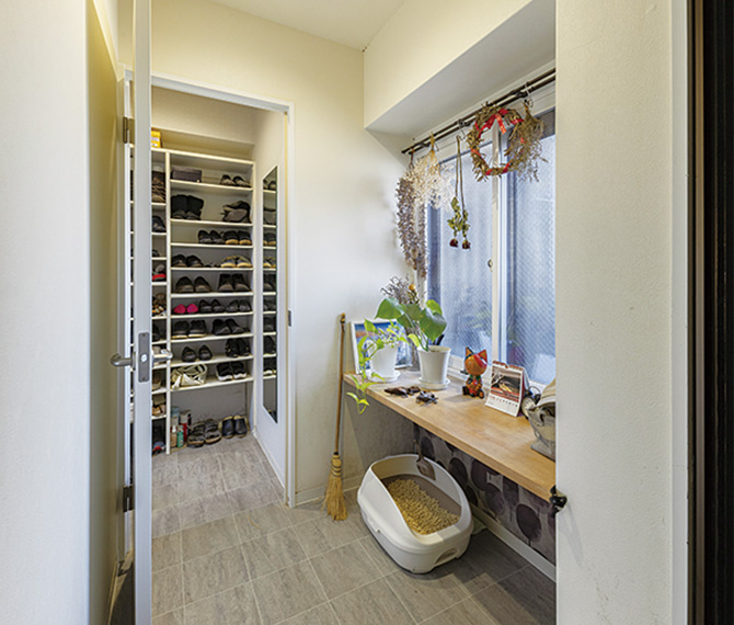 玄関脇の洋室を、玄関から続く納戸とシューズクローゼットに変更。カウンターの下は猫のトイレを置くスペースに