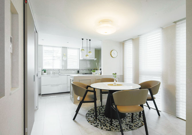 テーブルやマット、ペンダントライトなどに丸いフォルムを選んで優しい印象の空間を演出
