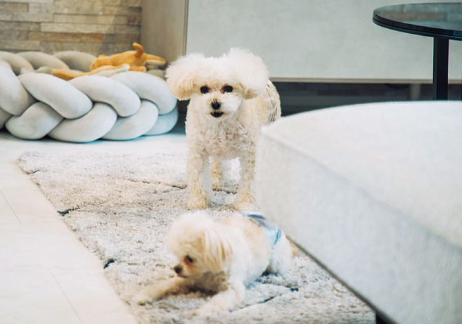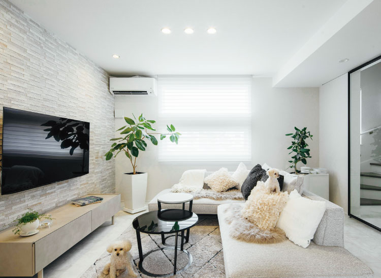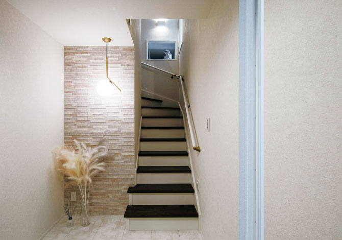 T様の好きな白を基調とした空間に、照明器具や時計などでゴールドを加え、アイアンの装飾を施すことで、ヨーロッパのホテルのような雰囲気を創出。直射日光が入らない北側に大きな窓を開口して、広い作業台と収納を備えたキッチンを配置した。洗面台は脱衣室から独立させて2階のリビング入り口と3階に配置。2階にあるペット室から、1階の階段を見下ろせるお出迎え窓をつくった。窓越しに帰宅した家族をいつも出迎えてくれるそうだ。
