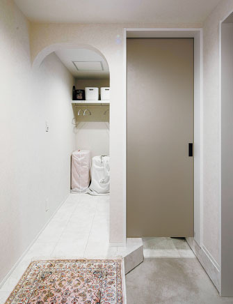 玄関横にはスーツケースや靴などを多く収納できる広い納戸を確保。