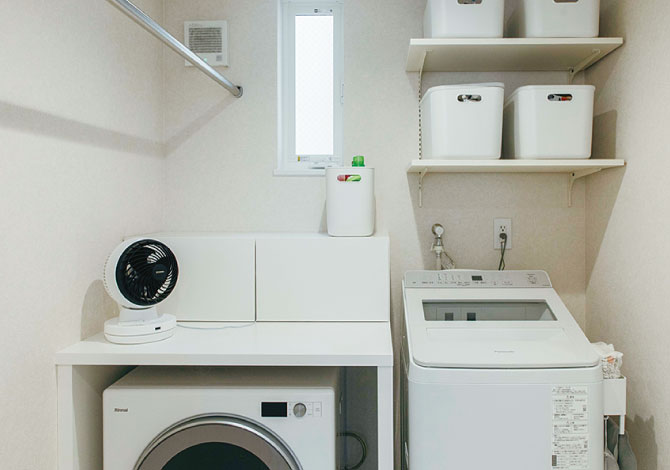 脱衣室の乾太くん専用に造作した収納台は、洗濯物をたたむなどの家事にも役立っている
