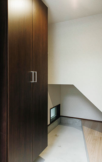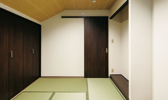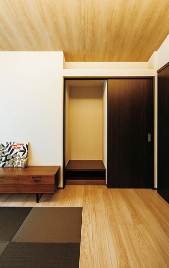 大容量の収納を設け、奥様が掛け軸や花を飾るための床の間も用意