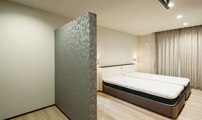 スマートフォンやメガネなどを置けるベッドヘッド付きのすっきりとしたベッドスペースと、壁を隔てて衣類などを収納する予定の納戸が隣接。