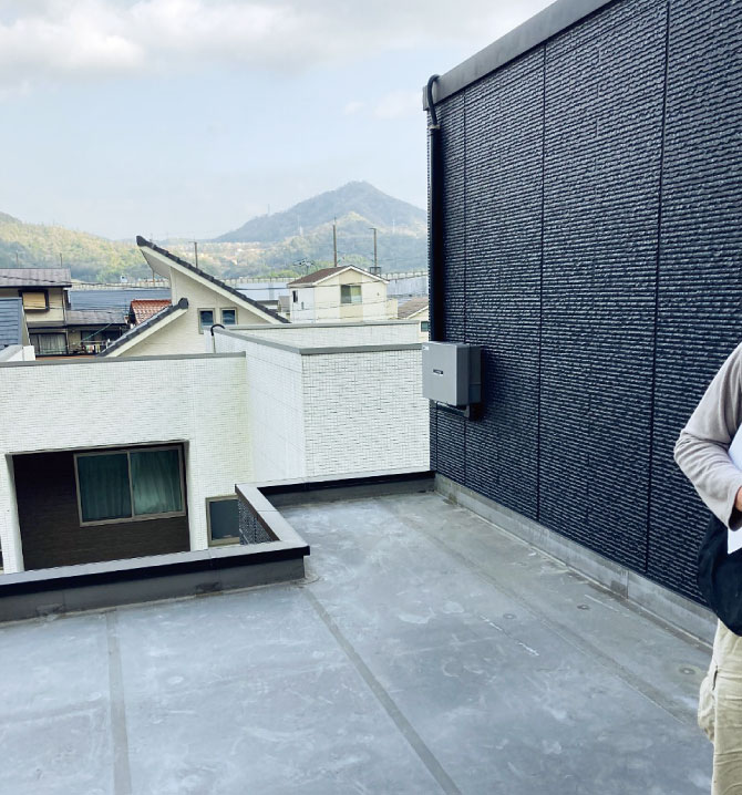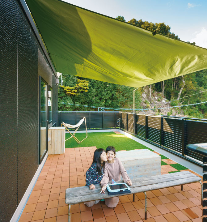 バーベキューを楽しんだり、お月見をしたり、本を読んだり、家族みんなのリラックススペースとなったルーフバルコニー。視界を遮る横スリットのフェンスで「高いところは苦手」という奥様も安心。