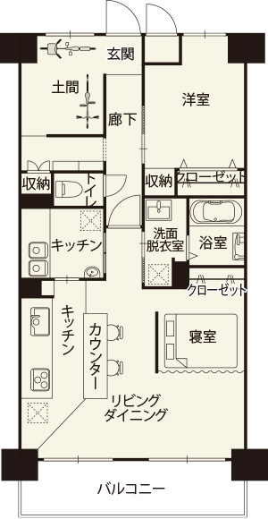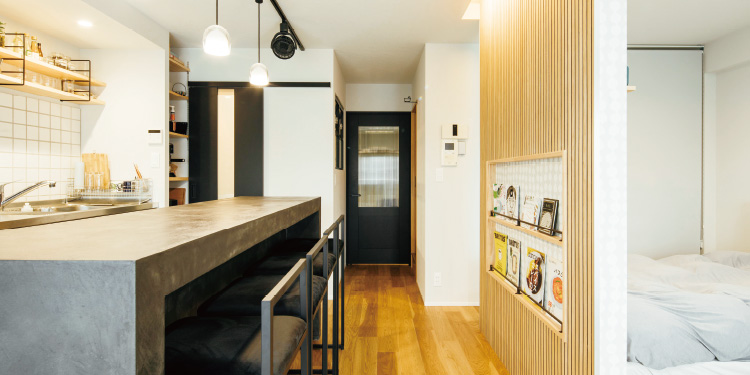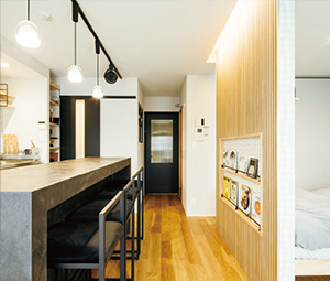 「自転車スペース用の土間」「パン作り専用のセカンドキッチン」という明確な希望があったこともあり、最初の打ち合わせから約2カ月で物件が見つかり、間取りプランを確認して4カ月後には物件を購入した。「マエダハウジングの担当の方が私のイメージを汲み取ってくださったので、スピーディーに決断できたのだと思います。土間スペースやキッチンについても、インターネットから気に入った写真を集め、担当の方に共有しました」。K様が知人の左官職人にモールテックスの塗装を頼んだカウンターは、友人と料理やお酒を楽しむお気に入りの場所。「カウンタータイプのダイニングテーブルを造作し、キッチン側に既製品の棚を入れることは後から思いついたのですが、快く対応してくださいました」。土間スペースに採用したエキスパンドメタルの間仕切りも「廊下を通るたびに自転車が見えてうれしくなります」と話す。「キッチンに住みたい」というK様の言葉を受け、LDKに寝室を配置。「住み心地は最高です!」と、晴れやかな笑顔が印象的だった。