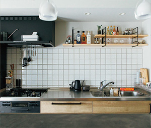 モールテックスの塗装を施したカウンターテーブルは造作。キッチンの白いタイルとマガジンラック付きの木目のアクセントウォールがカフェのような空間を演出している。キッチンのカウンターは、友人たちを招いて料理やお酒を出しながら会話ができるお気に入りの空間。内側は既製品の棚がぴったり収まる収納スペース。
