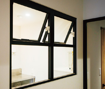 製菓用キッチンには室内窓を設置。オーブンの熱を逃がすのに役立っている。 「キッチンに住みたい」を実現した寝室