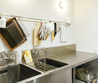 メインのキッチン横に設けた製菓用キッチン。ダブルシンクや湯水が出る水栓、背後には手洗い器など保健所の営業許可申請を配慮して計画。
