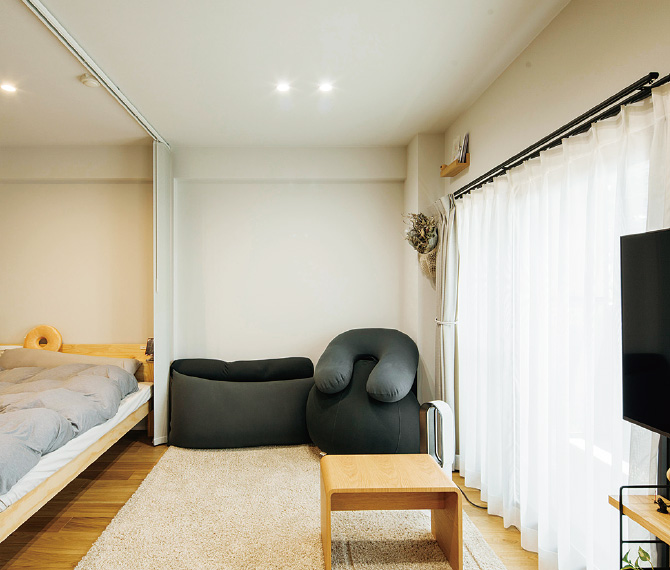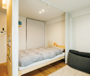 来客時に備えて仕切りを付けているが、普段は開け放してキッチンに住んでいるような理想の空間に。寝室の奥にロールスクリーン付きのクローゼットも用意。