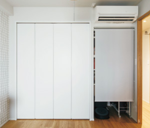クローゼットのほかに可動棚を取り付けた収納を設置。ロボット掃除機が出入りできるよう、扉ではなくロールスクリーンを採用。