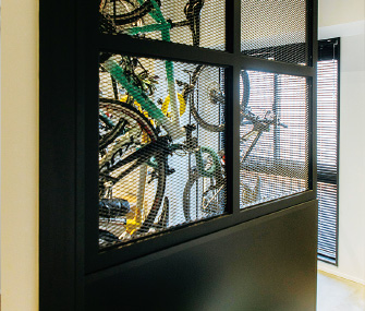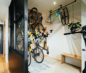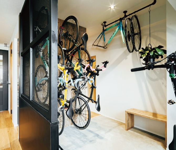 エキスパンドメタルの間仕切りが工業的な雰囲気を醸し出す土間スペース。訪れたゲストが最初に驚かされる、インパクトのある空間。 洋室をなくし玄関土間を拡大して自転車を収納できるスペースを用意。5台の自転車が収納できる土間スペース。壁際に置いたベンチはメンテナンスなどの作業中に腰掛けたり、天井に吊るしている自転車のホイールを取るための台として活用。