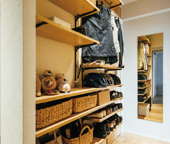 土間スペースと収納の間には有孔ボードを設置。外出前の身だしなみを整えるのに便利なミラーも用意。