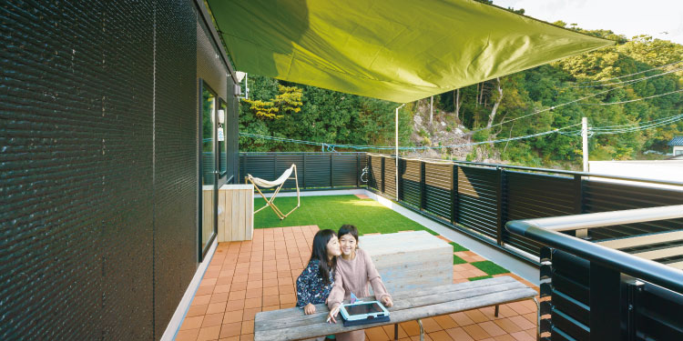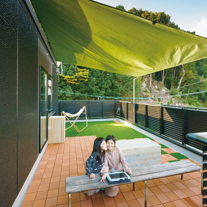 バーベキューを楽しんだり、お月見をしたり、本を読んだり、家族みんなのリラックススペースとなったルーフバルコニー。視界を遮る横スリットのフェンスで「高いところは苦手」という奥様も安心。