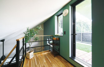ロフトの勾配天井にはダウンライトを設け広さを演出。縞模様が個性的なミモザの無垢床をグレイッシュグリーンのクロスで包み、落ち着きのある空間に仕上げている。