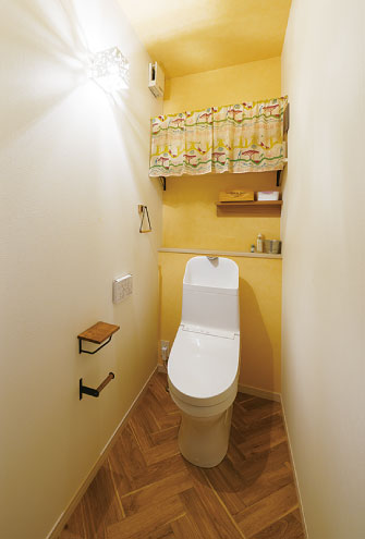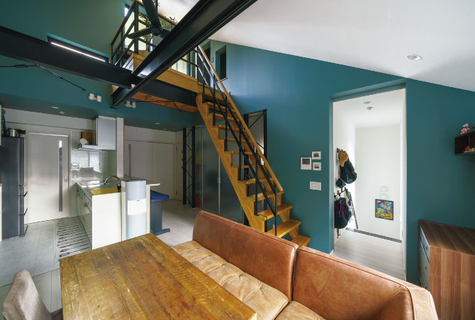 上部空間を利用して棚を造作し収納力をアップするとともに、床にはヘリンボーン柄のフロアタイルを張って高級感をプラスしつつコストダウンも実現 木とアイアンを組み合わせて造作した階段はインテリアとしても空間の表情を彩る