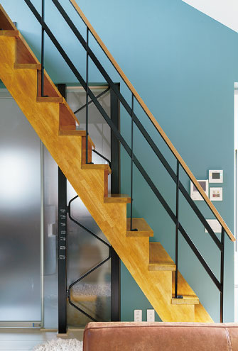 階段は、アイアンと木の組み合わせが好きな奥様の希望に応え、大工と家具職人が共同で造作。階段の勾配に合わせてアイアンと木の手すりを取り付けた。アイアンと梁の鋼材が、空間を引き締める効果も生み出している。