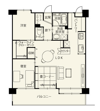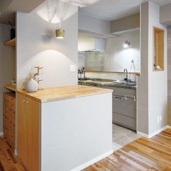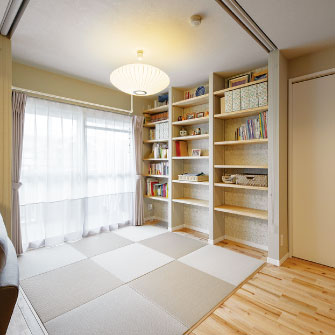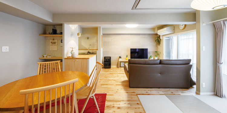 間取りは和室をなくしてLDKを拡大し、ゲストルームとしても使えるロールスクリーン付きの畳コーナーを用意。洋室2室は少し狭くして、ご夫婦の衣類をまとめて収納できるウォークインクローゼットを設置した。コンパクトなマンションの間取りを有効活用できるよう廊下はなくし、仕切りのない開放的なリビングダイニングにしたところ、以前に比べ家族の存在を身近に感じながら過ごせるようになった。収納も見直し、ずっとほしかったパントリーを設けたことで、収めたものを探す時間がなくなったという。キッチンは使い慣れた壁付きのままにしつつ、調理したものを一時的に置く場所がほしいという奥様の要望に応え、ごみ箱も収納できるオリジナルカウンターを造作。カウンターの横にはオープン収納をつくるなど、図面上でパズルのように組み合わせながら、理想的な間取りを実現した。「プランナーの方と相談しながら思い通りの家をつくることができました。計画中からとても楽しくて、リフォームして本当に良かったです」と、晴れやかな笑顔で話してくれた。