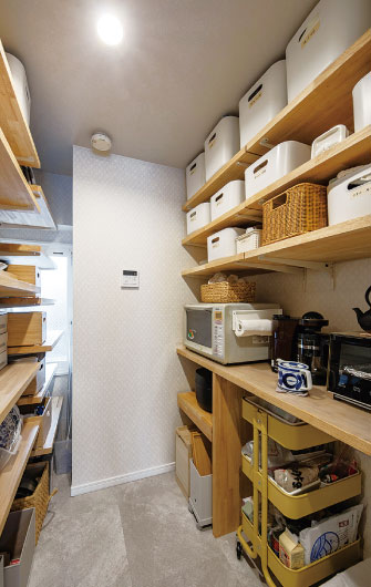 ダイニングの奥にはウォークインクローゼットを設置し、キッチンには大容量のパントリーを用意。キッチンの背後にはカウンターを造作して、浴室や洗面脱衣室は少しずつ広くして使いやすくした。