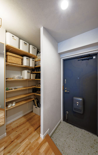 玄関に隣接する洋室のクローゼットをなくしてシューズクローゼットを設置。靴や傘などがたくさん収納できるようになり、常に片付いた状態が保てる