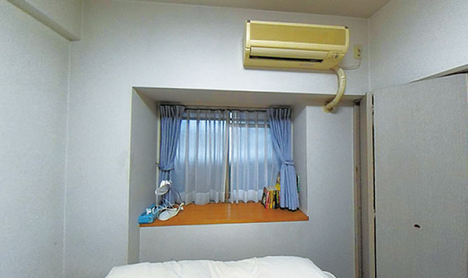夜だけロールスクリーンを下ろし、息子さんが布団を敷いて寝ている畳コーナーには造作の本棚も設けた