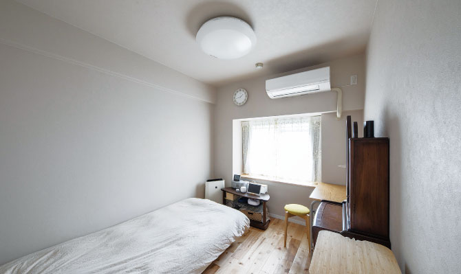 寝室も無垢のサクラ材とグレージュのクロスでLDKとの統一感をもたせた。