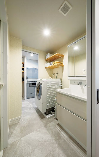 洗面脱衣室の床はキッチンと同じフロアタイルにすることで統一感をもたせた。リビング側の電話台をなくしてやや広くし、洗面台の位置も変えたことで使いやすくなった