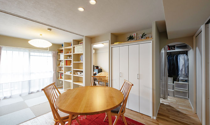 LDKからウォークインクローゼットへの入り口には扉を設けず、アーチ型の壁で緩やかに区切った。扉がないことで洗濯物をしまうときもスムーズに出入りできる