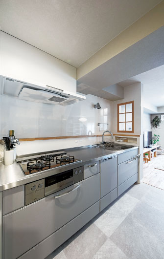 リビング側に室内窓を設けたことで手元まで明るい空間に。窓の下のニッチは調味料置きとして重宝している