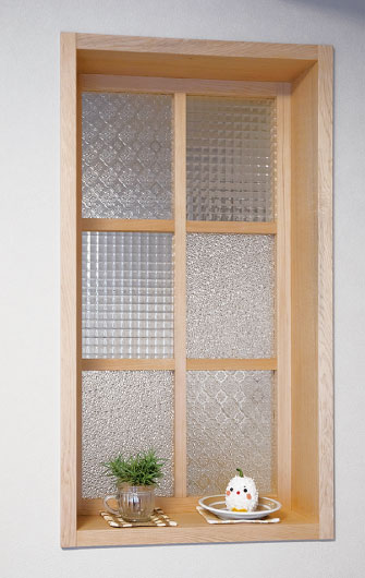 リビング側から見たキッチン横の室内窓。アンティーク調のガラスを使って、味わいのある窓に仕上げた。